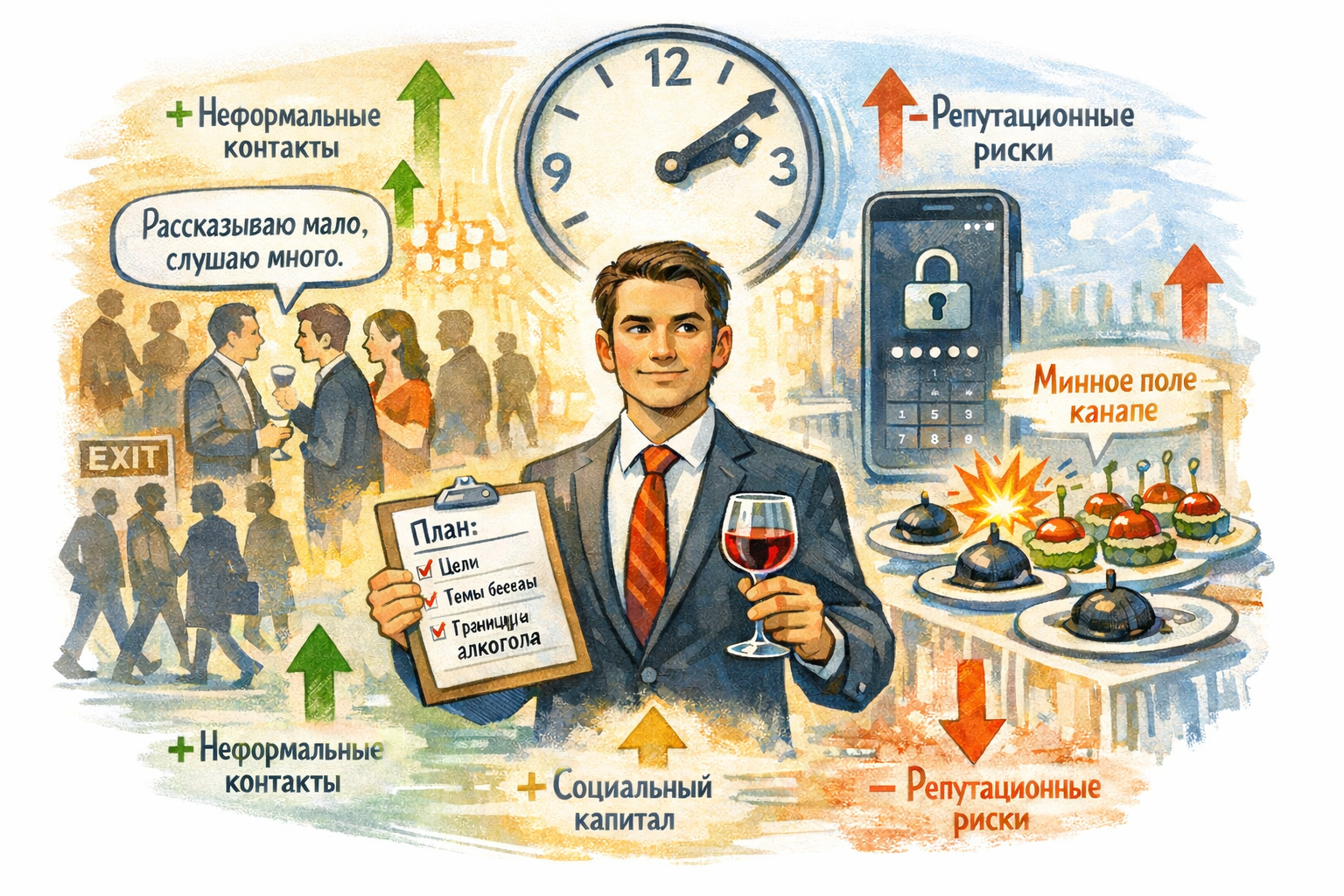 Продумайте логистику. Самые важные разговоры редко происходят за банкетным столом. Чаще они случаются в курилке, у лифта или в очереди за шаурмой в два часа ночи. Если весь вечер провести между ведущим и салатом «Цезарь», можно так и остаться для нужных вам людей незамеченным.